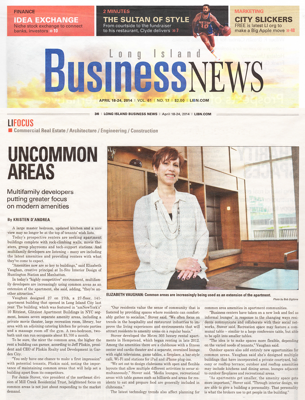 Our own Principal, Elizabeth, was quoted in the Long Island Business News recently about the Importance of Amenity Spaces in New Developments:
