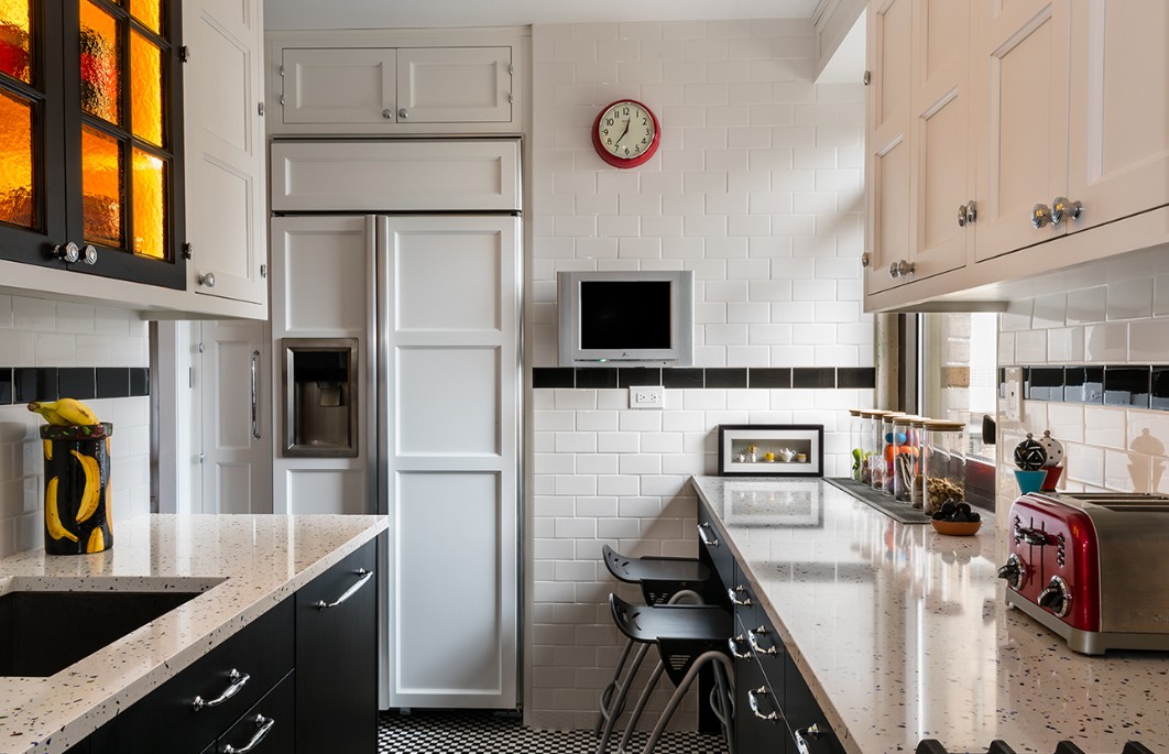 “In-Site did an incredible job renovating our kitchen/family room to help to sell our Chappaqua home. We loved Elizabeth’s work and the living room she’d designed for us a couple of years earlier, so we knew she was the right choice to transform the dark, dated space. In-Site understood this was not a total re-do, we were not changing the footprint or swapping out/re-furbishing the cabinetry. Their first step was to open things up and improve the flow by removing a massive stove hood and replacing it with three tiffany pendant lights. The orange countertops and backsplash were replaced with a sumptuous continuous slab of blue, gray granite, and a backsplash of tumbled marble and brass decorative accent tiles. Decorative moldings were added to “finish” the base cabinets and new stainless steel appliances were selected and installed. The ‘brick’ linoleum was replaced with beautifully nuanced wide plank hickory flooring, which helped unite the kitchen and family room and added a warmth and luster to the space. The dark wood paneling, moldings, and ceiling beams were stained a warm white to brighten, and a pearl gray paint on the walls freshened the space. We couldn’t believe what a difference it all made. We sold the house and are already starting to talk to In-Site about the possibilities of our new home.”