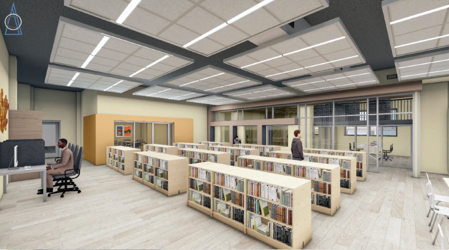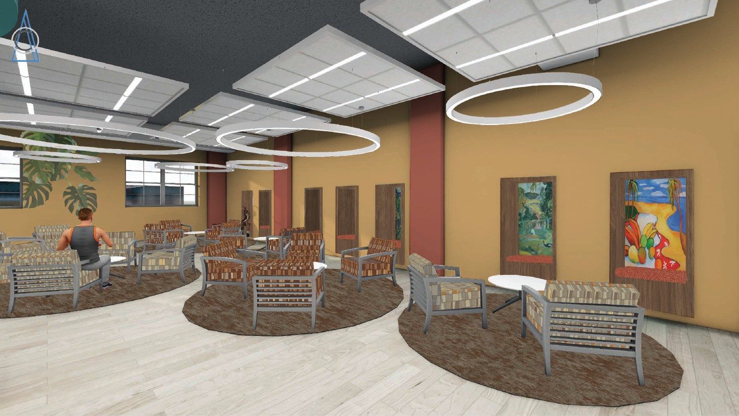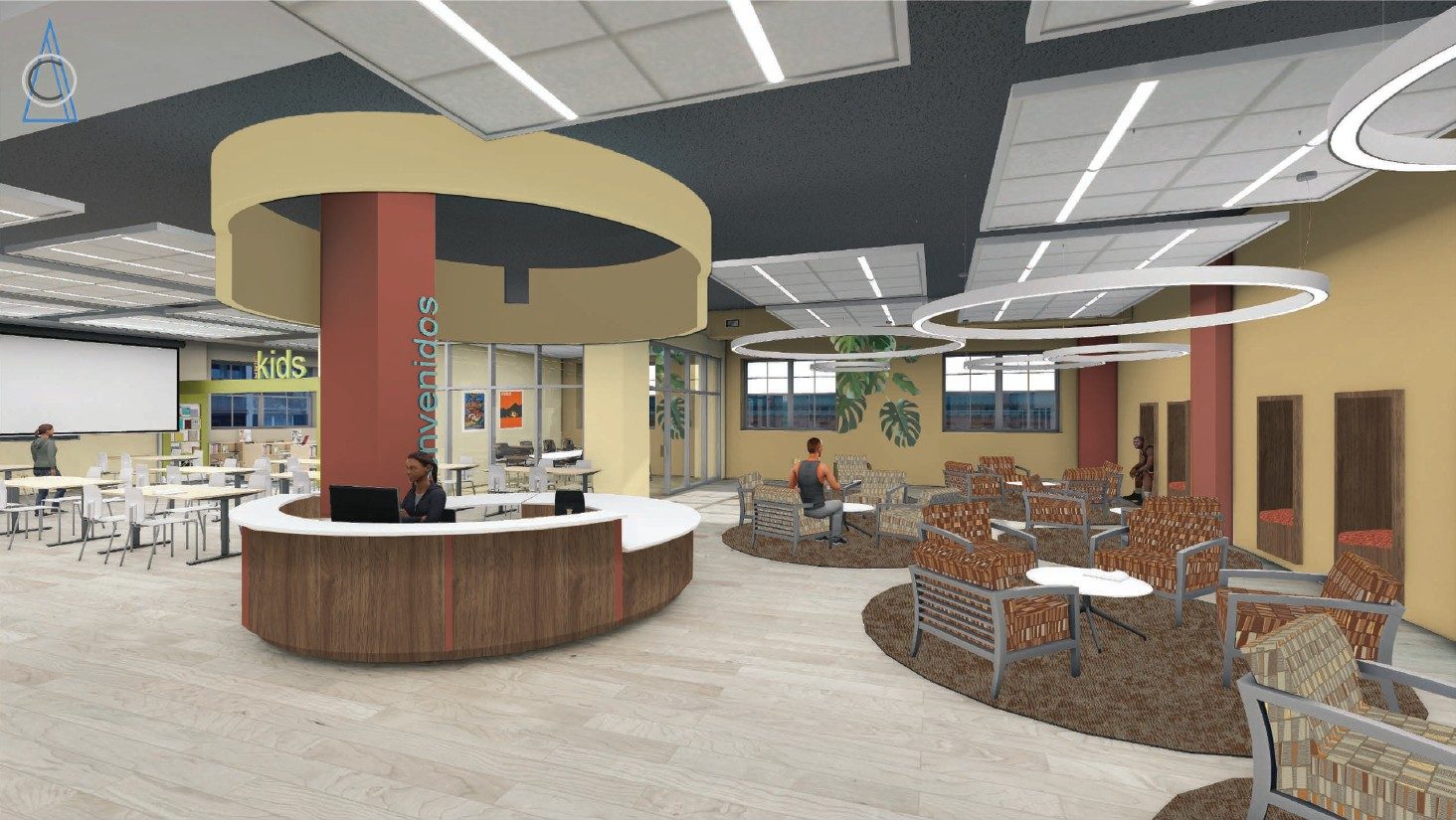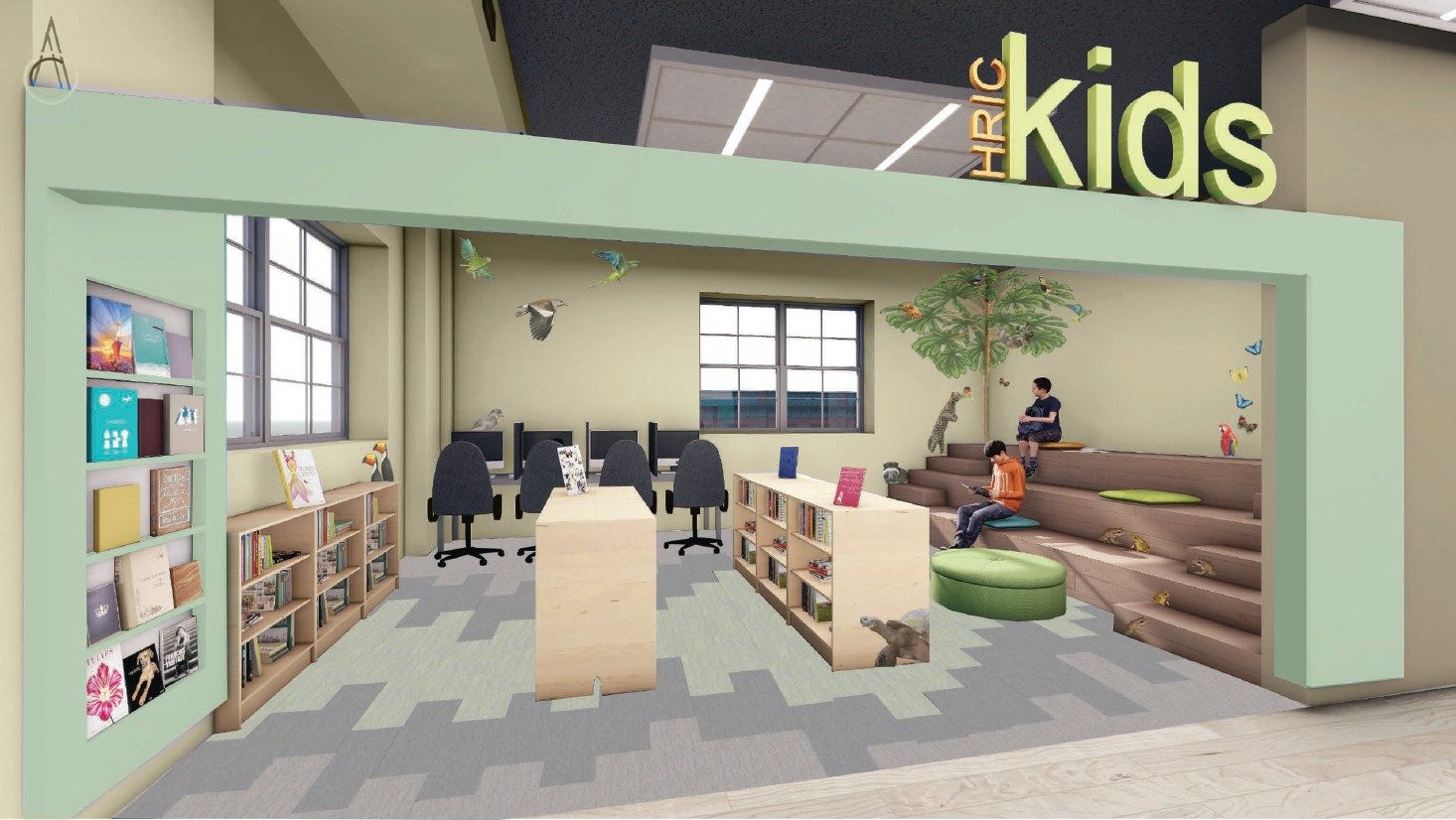The children’s section of the HRIC is a vibrant world of its own — playful, imaginative, and intentionally scaled for young learners. In this space, we used bold colors, tactile materials. The raised platform seating will support everything from quiet learning to interactive storytelling. One important decorative accent was the use of custom wall decals featuring native Hispanic animals, creating an exciting focal feature with an interactive learning opportunity. Cozy reading areas and smaller furniture make the space engaging and accessible, encouraging curiosity at every turn. Here, the children are given a comforting community space and the opportunity to explore and discover. With this design, we set out to create a dynamic space, an inclusive environment that sparks learning, creativity, and connection for all ages.